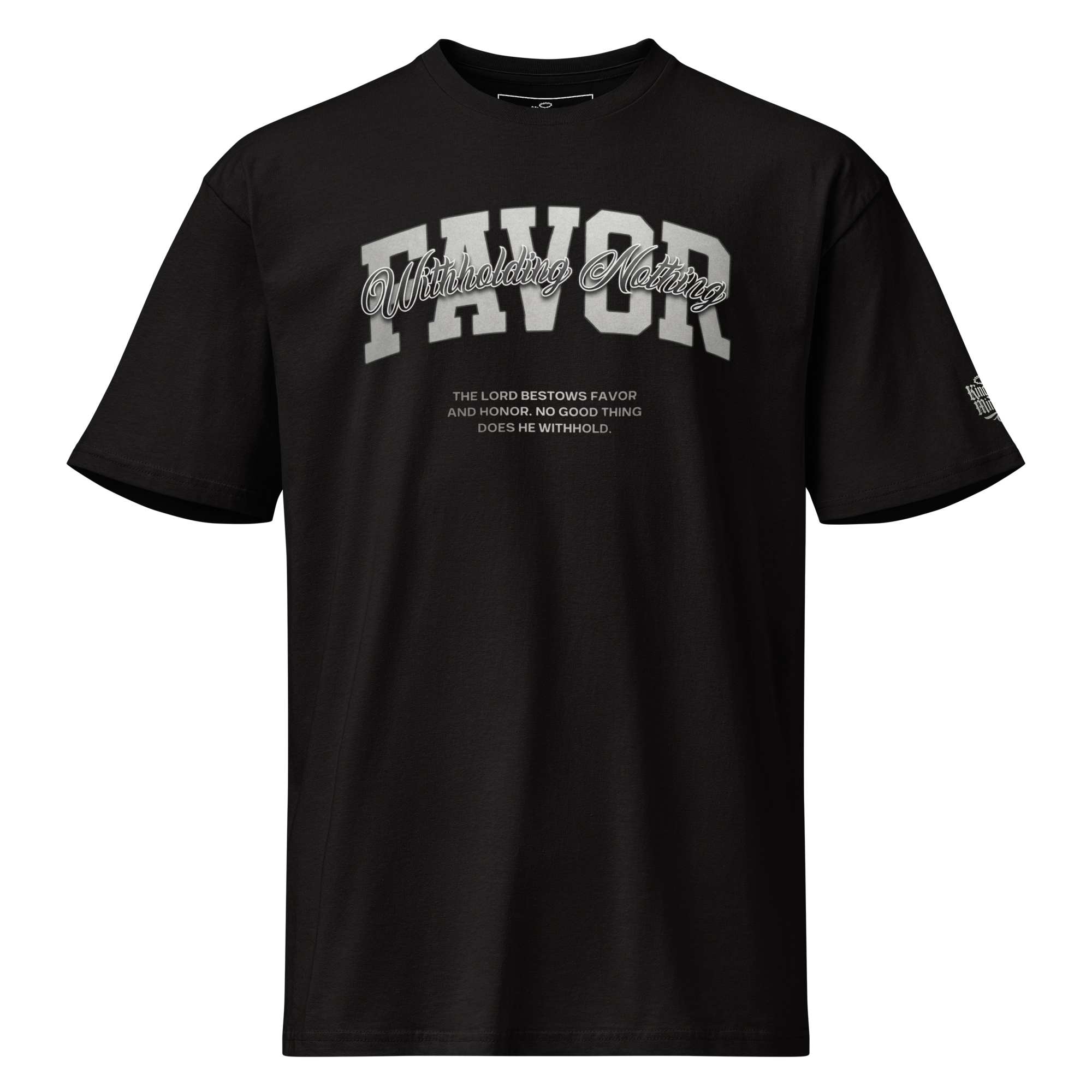 The Favor Short Sleeve Tee is a premium Kingdom Minded piece designed with a clean, elevated look and a message that carries weight. Featuring the Favor graphic on the front and the Kingdom Minded logo on the sleeve, this design brings together bold faith-centered expression and refined everyday style.